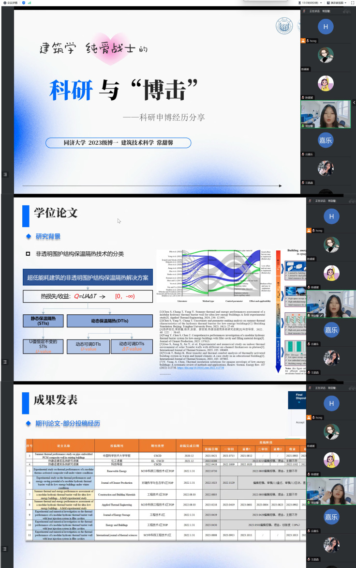 常甜馨同学是建筑学专业,她详尽分享了自己的科研和申博的经历,并对其学位论文《模块化热激活墙体能效与集成设计研究》进行了深刻分析。她还着重介绍了建筑技术科学研究热点概况——时下正热的人工智能技术在建筑领域的开发应用。陈媛媛同学的研究方向是城市植被物候、热环境监测与评价,她以时间为线索,细细梳理了申博的整个流程。从如何定目标学院、准备申博所需材料,到联系导师、笔试、复试的细微之处,为大家提供了宝贵的经验。