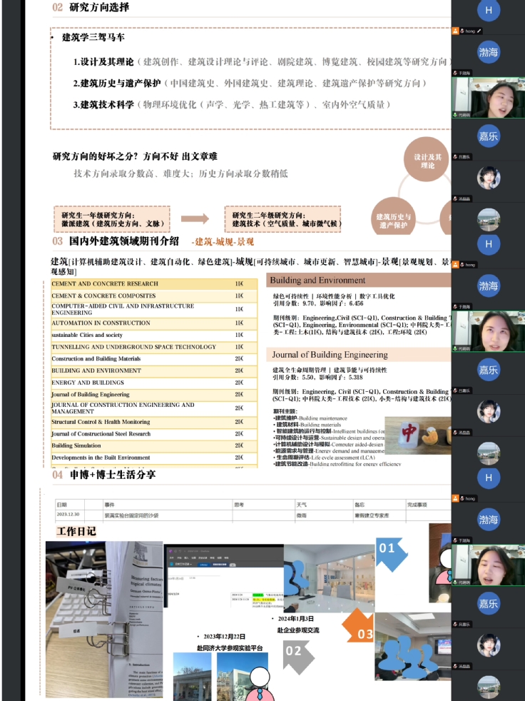 代萌萌同学是建筑学专业,她分析了建筑学不同研究方向的影响,详尽分享了自己的科研和申博的经历,为大家系统介绍了文献整理软件的异同和优劣,并推荐了如何综合考量是否要攻读博士的方法。汤晶晶同学的研究方向是城乡规划信息技术,她为大家详尽分享了自己主持或参加的多个纵向和横向课题,细细梳理了申博所需的材料以及撰写要点,为大家提供了宝贵的经验。