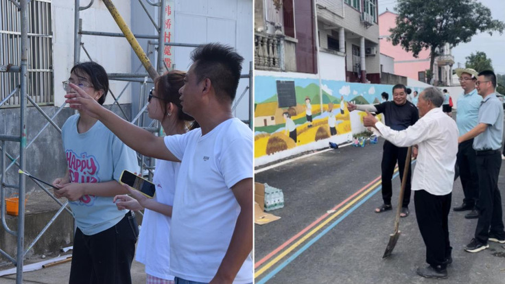 38℃的高温下,正午的墙面被晒得滚烫,同学们踩着梯子挥毫创作。画笔游走间,层叠的山峦、错落的屋舍与村民劳作的场景渐次浮现。墙绘既展现了乡村的自然风光与民俗文化,也寄托了对美好生活的向往。“乡村的墙会记得,我们用青春色彩为汤池振兴添过一笔亮色!”学生擦着汗说道。这幅充满生机的墙绘吸引了众多村民驻足,成为汤池村一道亮丽的新风景线。