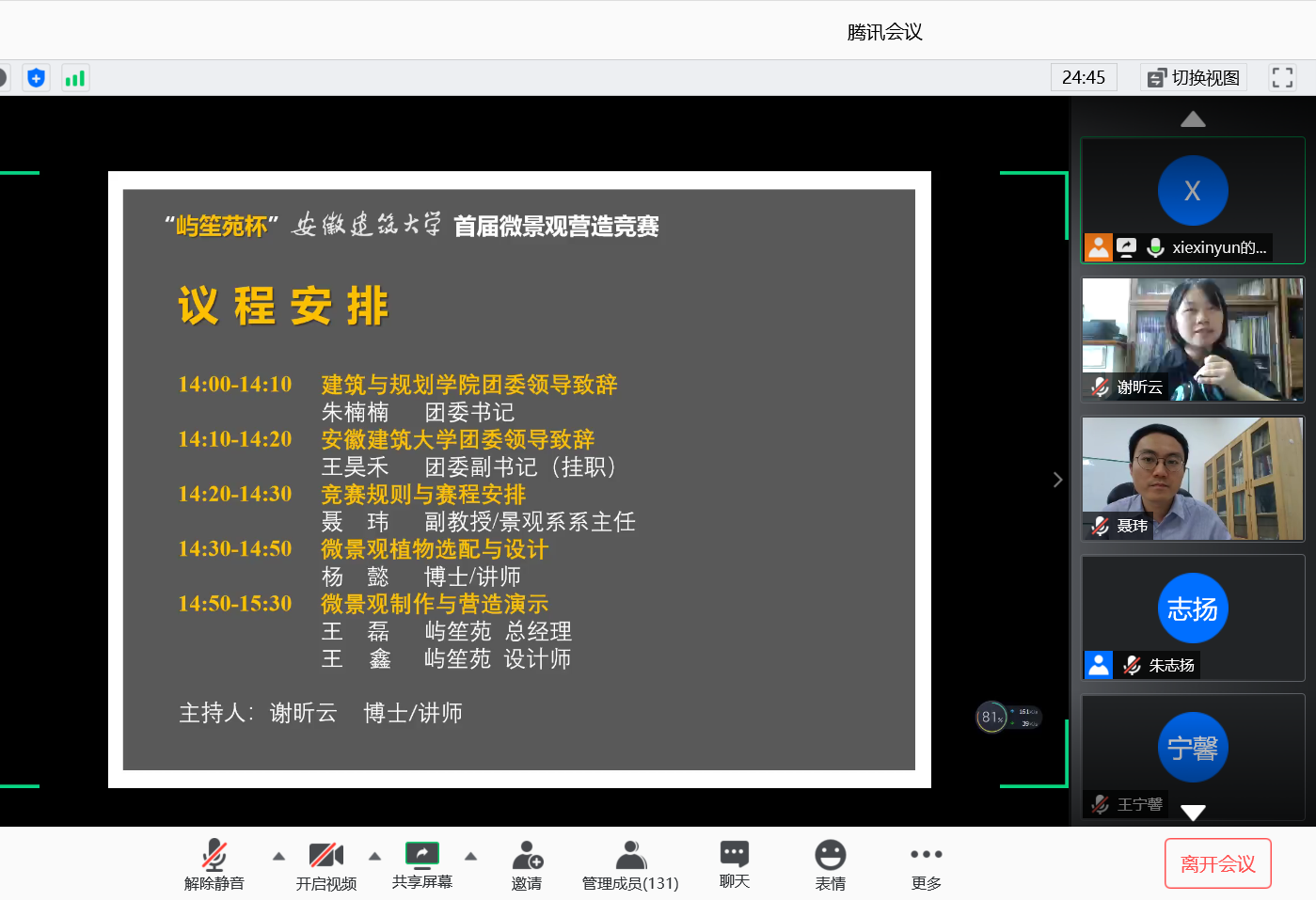 来自屿笙苑的设计师王磊、王鑫通过直播向大家演示了微景观营造的完整过程和操作细节,并与同学们展开了激烈互动,回答了同学们的疑问与困惑。整个开幕活动持续了两个多小时,活动由景观系谢昕云老师主持。(作者:朱志扬,审核:唐劲松)