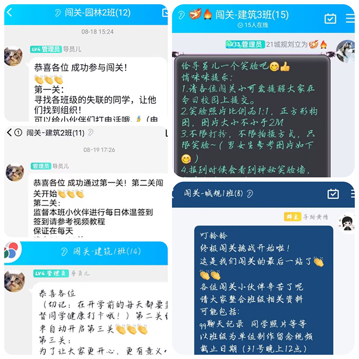 QQ闯关挑战分为“寻找伙伴”“监督体温签到”“宿舍分配调查问卷”“给导员儿一个笑脸吧”“新生报到统计”“闯关总结视频”六个环节,让入学报到流程变得新颖有趣。线上沟通不但调动了学生的积极性和参与感,更培养了同窗之间的浓浓情感。“网上的你我已经认识了,现实中的你会是怎么样的呢?好期待!”