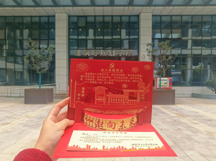 为了让“政治生日”更加深入人心,学生党支部精心制作了载满祝福和希望的贺卡。贺卡主页印有“新时代 新征程”“一起向未来”字样,整体设计美观、庄重大气。鲜红色的“政治生日”贺卡,不仅承载着所支部最诚挚的问候,让党员们感受到了组织的温暖,搭建了党组织与党员之间的“连心桥”,传递着党支部的关心、希望和激励。
