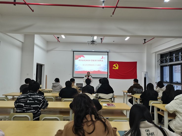 仪式最后,支部书记李芬同志以《踔厉奋发担使命,勇毅前行谱新篇》为题解读二十大精神,为全体党员授课辅导。李芬结合工作实际和学习感悟,从党的二十大召开的重大意义、党的二十大主题、怎样学思践悟、推动党的二十大精神落地生根等四个方面解读了党的二十大精神。同时,以提问的形式,了解学生党员对党的知识掌握情况。谈到入党动机,李芬强调“入党积极分子首先要端正入党动机,树立为同学服务的理念,将集体利益放在首位”。