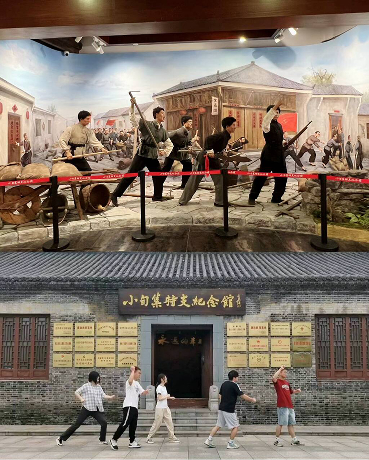 城乡规划专业学生党支部学生党员代表、青年先锋团的退役大学生士兵代表、安徽省弘扬社会主义核心价值观名师工作室逗留工作室成员在小甸集特支纪念馆前利用拍摄复制历史名场面转场短视频的方式,重现“瓦埠暴动”历史瞬间,让同学在镜头前倾情演绎历史片段,沉浸式感受到人民群众的武装斗争精神,体会安徽省“第一面党旗”升起的澎湃,发出当代青年爱国的。