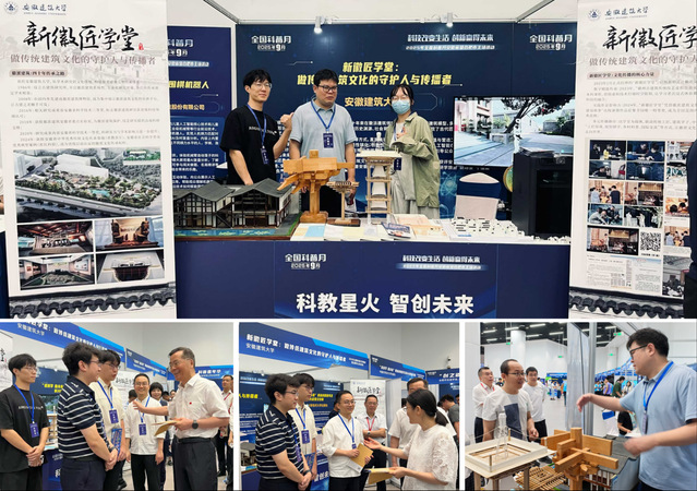 本网讯 9月7日,2025年全国科普月安徽省暨合肥市主场活动在安徽省科技馆正式拉开序幕。本次活动由安徽省科学技术协会、合肥市人民政府、安徽省全民科学素质纲要实施工作办公室成员单位共同主办。安徽省人大常委会副主任、省科协主席韩军,安徽省人民政府副省长任清华等出席启动仪式。由我校报送的“新徽匠学堂:做传统建筑文化的守护人与传播者”项目成功入选参展,成为本次活动中唯一以建筑文化为主题的展示项目,充分体现了我校在徽派建筑文化传承与创新方面的深厚积累与社会影响力。