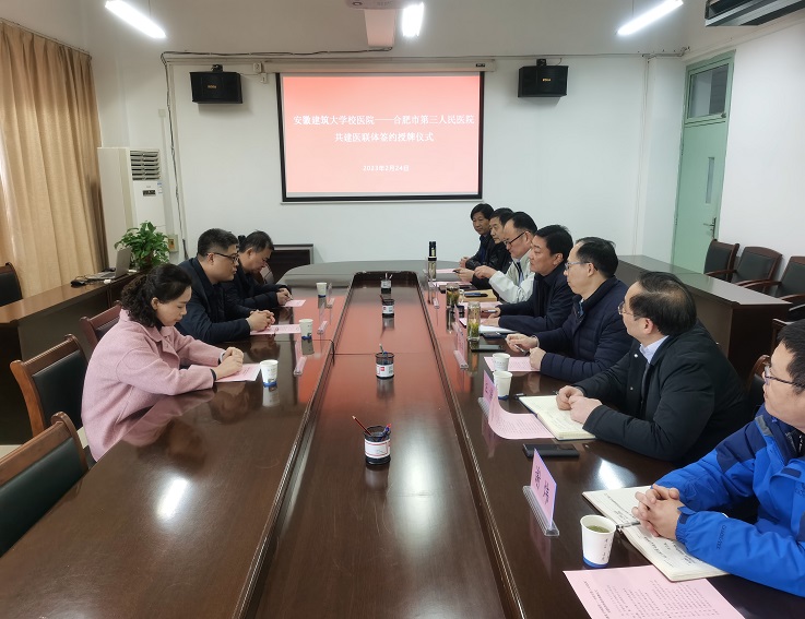 本网讯 2月24日,合肥市第三人民医院与我校校医院共建医联体合作签约揭牌仪式在南区主教楼1812会议室举行。合肥市第三人民医院副院长沈泌等一行3人,校办公室、人事处、学生处、离退休工作处、后勤服务集团及校医院有关负责人参加签约仪式。