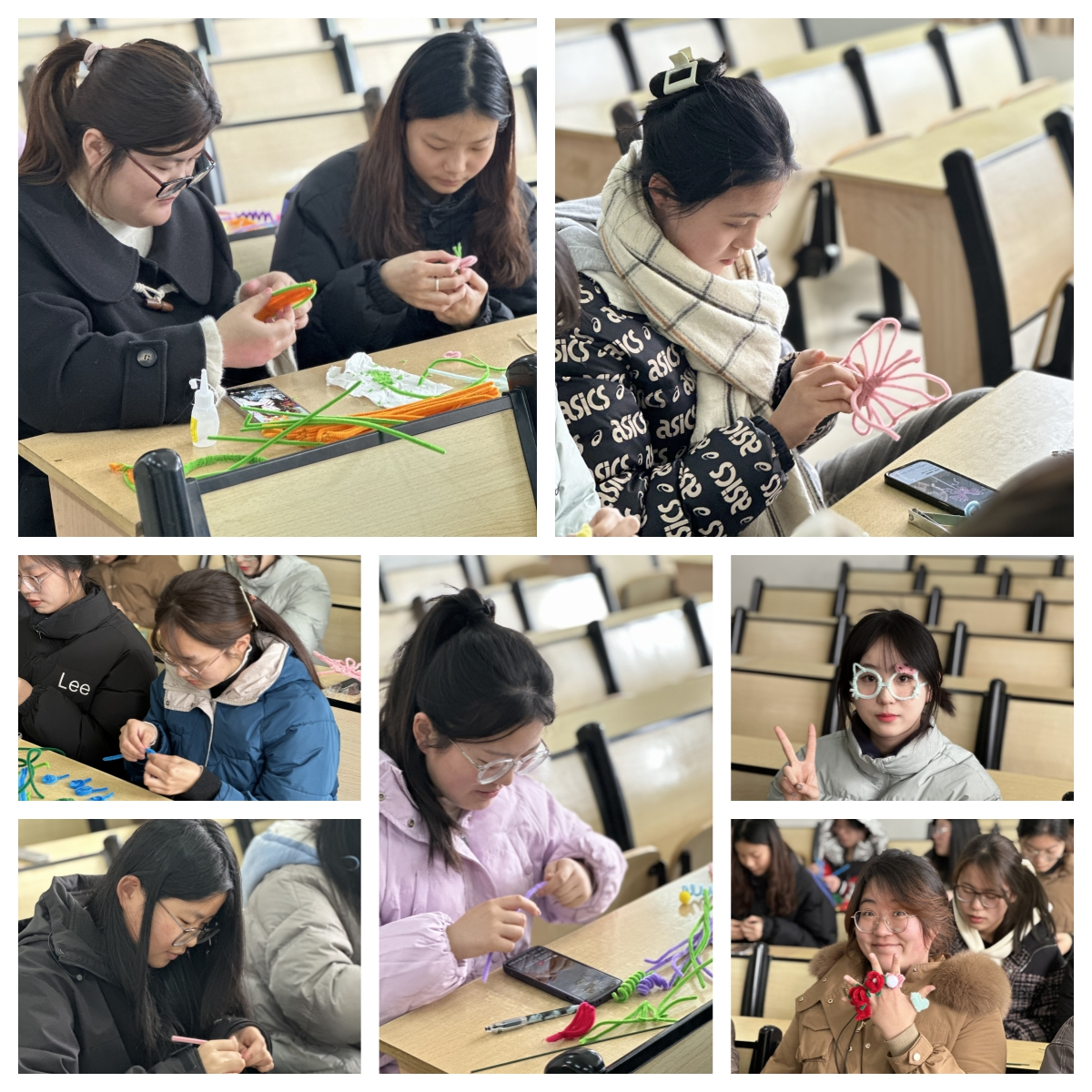 活动现场,女生们欢腾雀跃,尽情释放,散发真我风采。活动过程中,大家充分发挥想象和创意,精巧构思,互相借鉴,相互帮助,配合默契,灵活地运用五颜六色的扭扭棒制作了一件件精美的手工发箍、手工花朵等作品,让现场充满了春的寓意和希望。