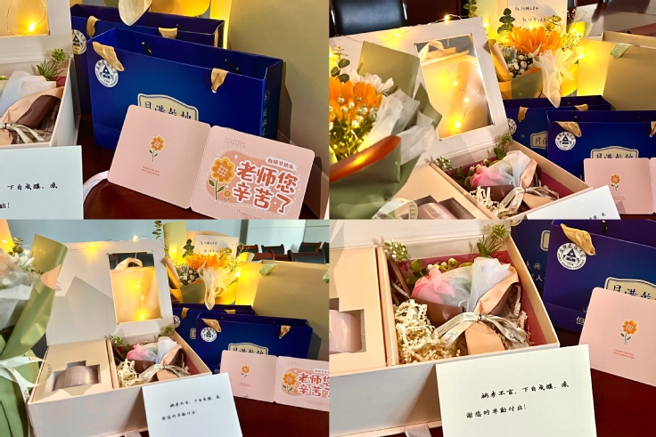 在教室和学院办公室,同学们将一束束精心挑选的鲜花和精心挑选的香薰礼盒献给敬爱的老师们,一句“老师,您辛苦了!祝您教师节快乐”饱含着学生们深深的感谢和由衷的敬爱,老师们接过鲜花和礼盒,脸上洋溢着幸福的笑容,场面温馨而感人。平日里老师们挥洒汗水,倾情付出,换来学生们句句祝福,简单又饱含深情。