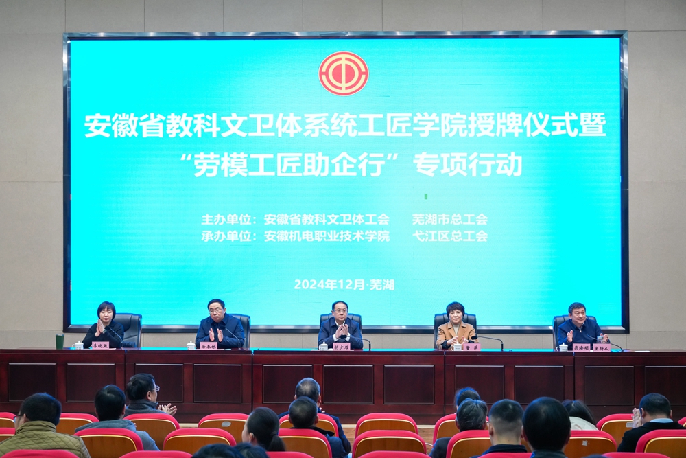 本网讯 12月11日,安徽省教科文卫体系统工匠学院授牌暨“劳模工匠助企行”专项行动在安徽机电职业技术学院举办。省总工会党组成员、副主席胡少石出席活动并讲话。芜湖市人大常委会副主任、市总工会主席董萍,安徽机电职业技术学院党委副书记、院长徐春林出席活动并致辞。高校劳模专家、企业代表及各相关单位工会负责人近50人参加活动。