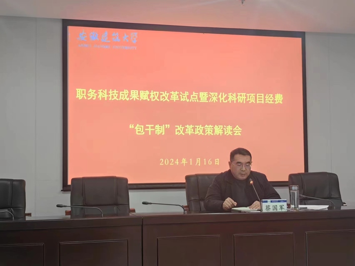 蔡国军传达了安徽省职务科技成果赋权改革试点系列会议和全省职务科技成果赋权改革试点暨深化科研项目经费“包干制”改革试点动员会大会精神。
