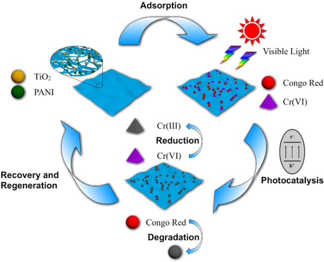 图3. PAN/TiO2/PANI杂化纤维膜吸附和光催化再生示意图