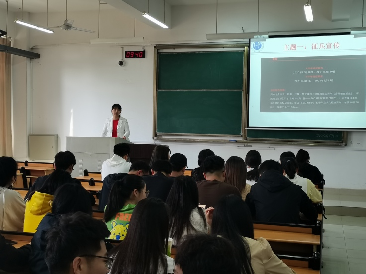 各班级辅导员利用线上网络平台、线下主题班会,向全体同学宣讲了应征入伍的重要意义,介绍了秋季征兵的时间、条件和流程,并解读了安徽省激励大学生参军入伍若干措施。结合秋季征兵特点,有针对性的开展毕业班学生的征兵宣传教育动员大家要有责任、敢担当,积极应征入伍,为国防和军队现代化建设贡献自己的力量。
