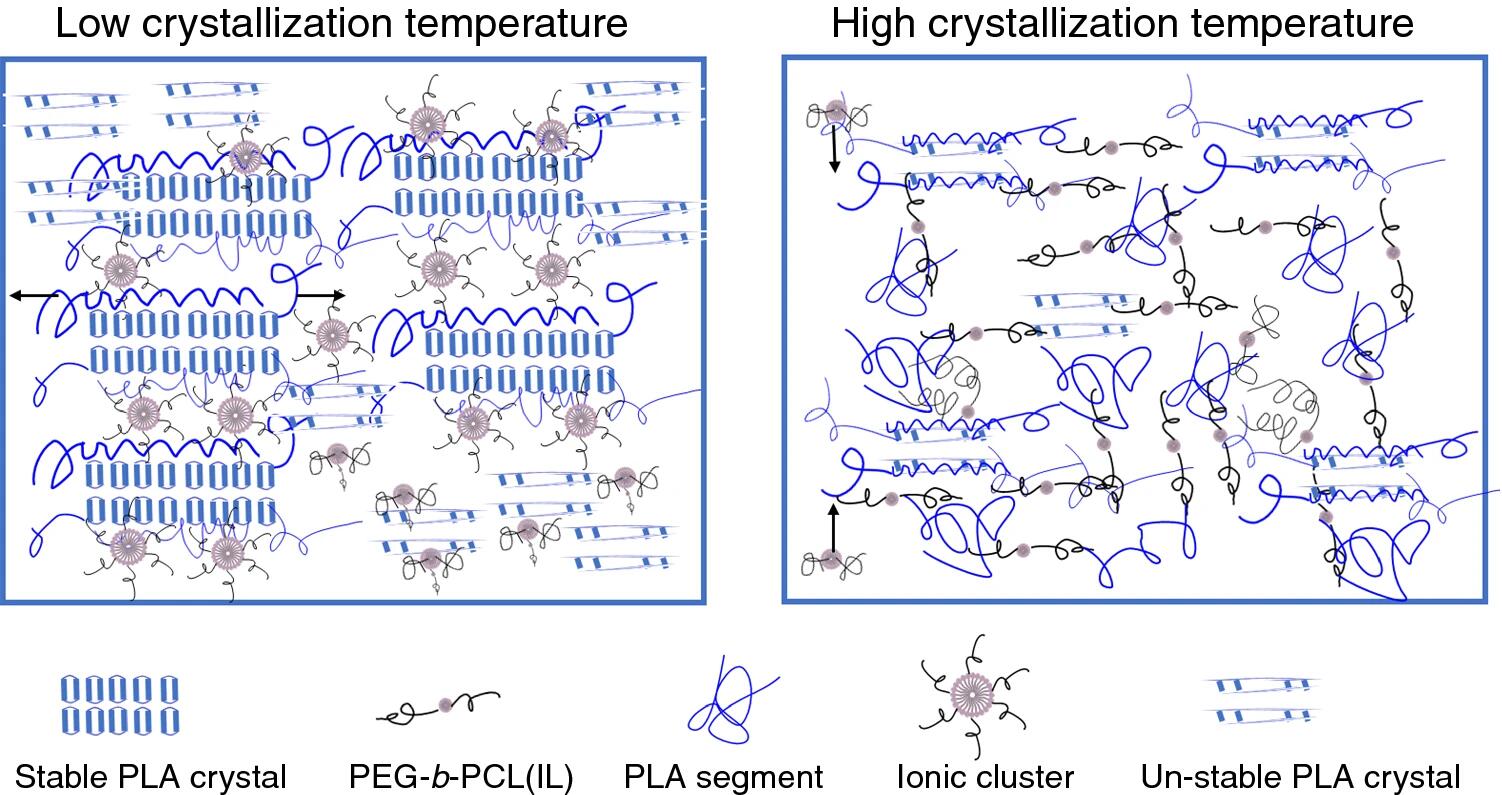 此外,针对可再生、可生物降解的聚乳酸(PLA)材料的功能化与高性能化。该团队通过将ILs链段引入含有PEGPCL链段的嵌段共聚物TAPEC,研究两者对PLA聚集态结构的调控作用,并在此基础上研究TAPEC离子化前后对PLA结晶性能的影响,探讨离子基元在PLA结构演化过程中的作用机理。相关成果在Journal of Thermal Analysis and Calorimetry上发表(IF4.626)。