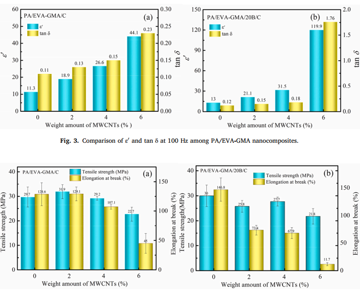 王平博士及其研究团队通过熔融共混法将羟基化钛酸钡(BT-OH)和多壁碳纳米管(MWCNT)引入聚酰胺(PA)和乙烯-醋酸乙烯酯-甲基丙烯酸缩水甘油酯无规三元共聚物(EVA-GMA)共混物中。利用BT-OH的高介电常数以及聚合物与两种纳米填料之间显著的界面极化效应。制备了具有高介电常数、低介电损耗以及优异刚韧平衡性的PA/EVA-GMA/20B/4C复合材料。相关成果在Composites Communications上发表(材料类TOP期刊;IF6.617)。