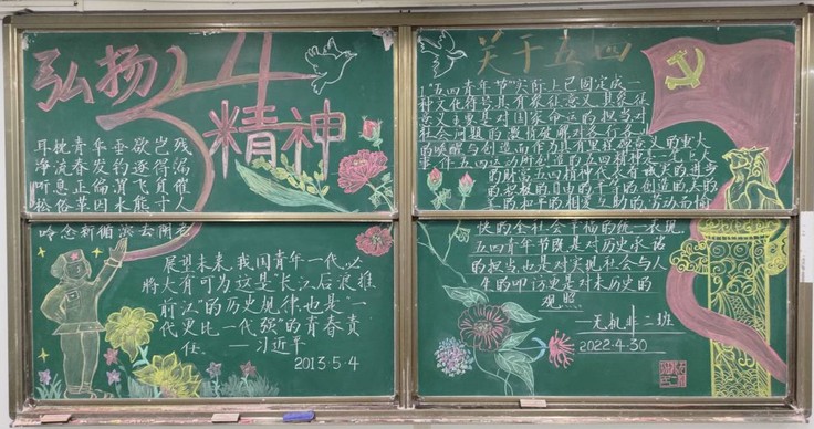 为传承和发扬五四精神,各班级团支部开展主题为“青春华章,你我共绘”的五四青年节黑板报设计活动。各班级同学围绕主题进行精心绘制,用画笔表达自己与祖国共奋进、与党同发展的时代精神,一幅幅精美、内容充实的板报作品展现青年学生朝气蓬勃、奋发向上的时代风貌,激发了学生的爱国爱党热情。