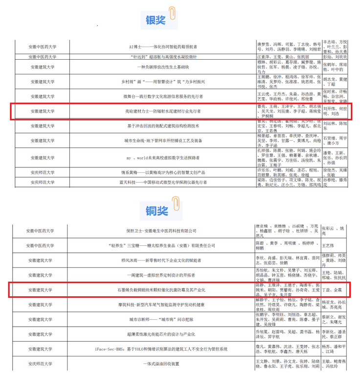 自大赛启动以来,我院对此项比赛高度重视,迅速落实相关工作。院团委积极宣传、广泛动员全体师生参加比赛,并精心组织优秀项目的遴选工作。通过前期备赛,共征集21份作品,经过院内选拔评审,共推荐了8份作品参赛。其中由无机非金属材料工程系教师刘开伟指导的曹亮、王萌团队的作品《亮砼建材力士——防辐射水泥建材行业先行者》获得大赛银奖,由金属材料工程系教师金震指导的陈静、王雁泽团队作品《石墨烯负载铜银纳米颗粒催化抗菌防霉及其产业化》获得铜奖。