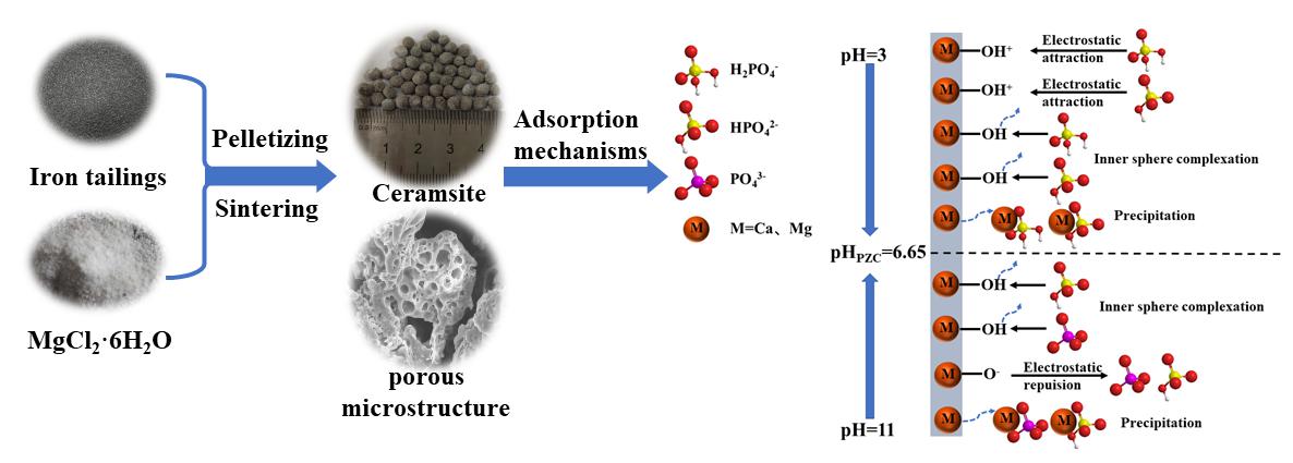 本研究以铁尾矿为主要原料,氯化镁为改性剂,制备了一种改性陶粒用于水体中磷酸盐去除。确定了改性陶粒的最佳制备条件为铁尾矿:MgCl2=50:15、预热300℃,10 min、烧结800℃,60 min。考察了吸附剂投加量、接触时间、温度、pH值、NH4+浓度、共存离子等因素的影响,并探究改性陶粒吸附磷酸盐后的缓释能力。结果表明,投加量为1g/L、初始磷浓度为100 mg/L,吸附过程最符合准二级动力学模型和Sips模型,属于多层化学吸附。磷酸盐吸附量受pH显著影响,pH=6时达到最大吸附量10.24 mg/g。NH4+浓度为100 mg/L时,有利于磷酸盐和氨氮的同时去除。该工作为开发环保可回收磷吸附材料提出了新的思路。(原文链接:https://doi.org/10.1016/j.seppur.2023.124817)(作者:肖必华;审稿:丁益)