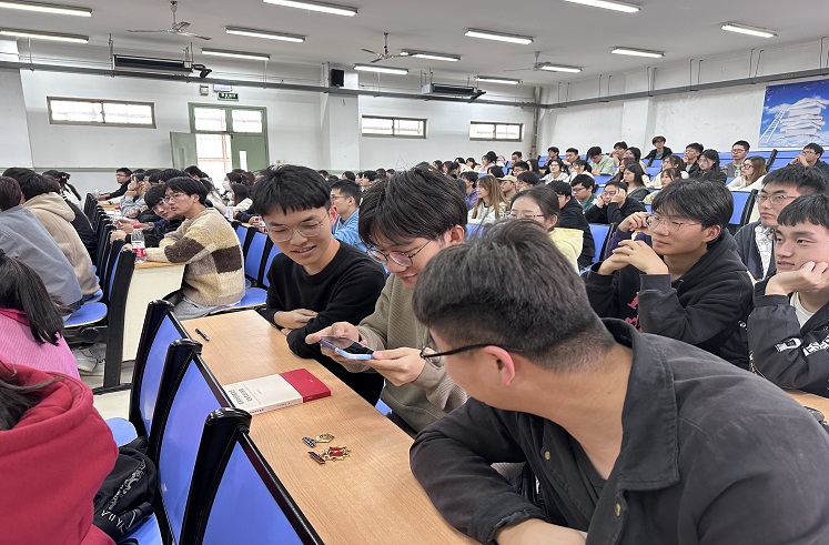 讲到“两弹一星”精神时,陈老向同学们展示了两枚珍贵的勋章:一枚是原子弹爆炸50周年纪念章,一枚是氢弹爆炸40周年纪念章。同学们一排一排的传阅,小心翼翼地捧起这珍贵的荣誉勋章仔细观察。22级应用化学2班的王康同学说:“当我接过这两枚沉甸甸的勋章,我的内心很激动,‘两弹一星’精神包含着热爱祖国、无私奉献,自力更生、艰苦奋斗,大力协同、勇于登攀,我们青年大学生一定要继承和发扬好科学家精神,用知识提升自己,用奉献回馈社会,努力成为一名合格的共产党员。”