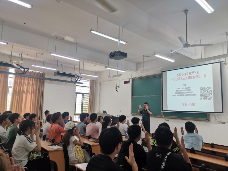 本次培训在王教授风趣的开场白下正式开始,他借助生动有趣的典型案例,向同学们展示心理问题的类型、影响及积极应对策略。培训紧紧围绕大学生活实际,紧密结合大学生年龄与身心特点,针对大学生活中经常遇到的新生适应问题、学业困难问题、情感问题、人际交往问题、求职就业问题等相关方面,运用心理学相关理念与方法进行阐释说明,并提出积极有效的应对举措。讲座中播放了心理实验视频,通过视频分享,进一步启发了广大同学们应高度重视心理健康,培养良好习惯,正确看带自我、看待顺逆与成败。