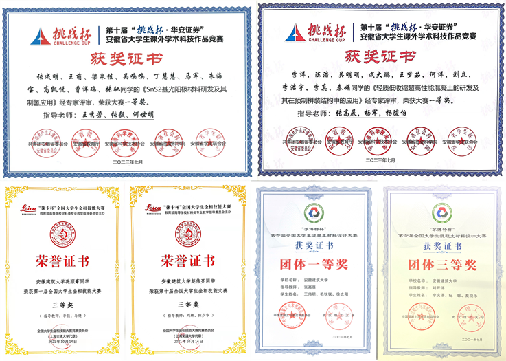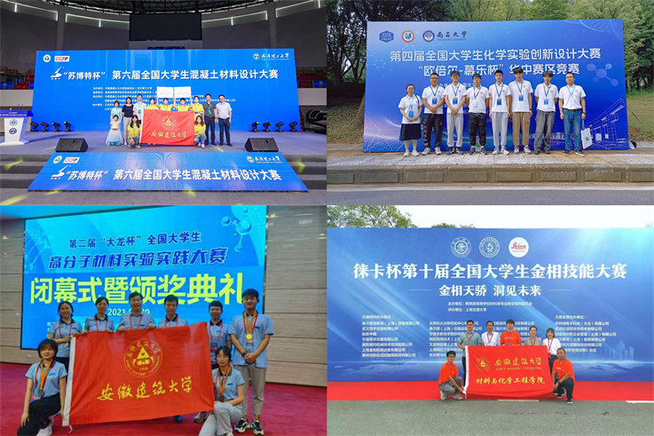 鼓励师生参加国家级、省级等各类技能竞赛和创新创业大赛,让竞赛成为专业教学改革与学生技能培养的有效载体和实践平台。经过学院齐心协力的探索与实践,近年来,学科竞赛与创新创业赛事取得显著成效。获得挑战杯全国大学生课外学术科技作品竞赛铜奖1项,安徽省金奖2项、银奖3项、铜奖4项;获得互联网+全国大学生创新创业大赛铜奖1项,安徽省金奖2项、银奖5项、铜奖9项;获得全国大学生混凝土材料设计大赛一等奖3项、二等奖2项、三等奖2项;获得全国大学生高分子材料实验实践大赛一等奖3项、二等奖2项、三等奖4项;获得全国大学生化学实验创新设计华中赛区二等奖2项、三等奖2项;获得安徽省普通高等学校大学生化学竞赛一等奖1项、二等奖2项、三等奖2项;获得全国大学生化工设计竞赛一等奖1项、二等奖3项、三等奖4项,同时获得华中赛区特等奖1项、二等奖5项、三等奖5项;获得第十三届全国大学生金相技能大赛一等奖1项、二等奖4项、三等奖13项,获得安徽省一等奖1项、二等奖5项、三等奖14项。