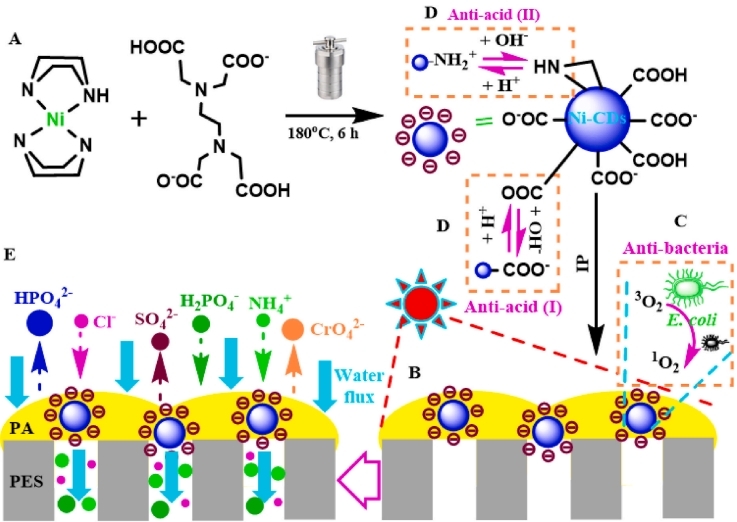 本研究以Ni2+、PIP和Na2EDTA为前驱物,水热法制备了镍掺杂的碳点(Ni-CDs)。Ni-CDs具有较高的负电荷、光敏性和耐酸性。将Ni-CDs集成到PA层中,通过IP法制备了Ni-CDs掺杂的纳滤膜(Ni-CDs-Ms),实现了对纳滤膜微观结构与分离性能的调控,改善了纳滤膜的亲水性和膜表面粗糙度等理化性能,极大地提高膜对一、二价阴离子的分离性能。此外,该纳滤膜还继承了Ni-CDs的抗生物污染与耐酸性能,有助于降低运行成本,延长纳滤膜的使用寿命。值得注意的是,Ni-CDs和0.25-1.0%-Ni-CDs-Ms都能够对废水中的Cr(VI)具有选择性荧光响应。其中,0.75%-Ni-CDs-M应用于废水中Cr(VI)的超高灵敏度实时监测及高效脱除,在0.08-11.6 ppm线性范围内展示了低至0.072 ppm的检测极限。该方案有助于纳滤膜的可持续和经济运行以及为环境中突发性Cr(VI)事件的预防和处理提供技术支持。