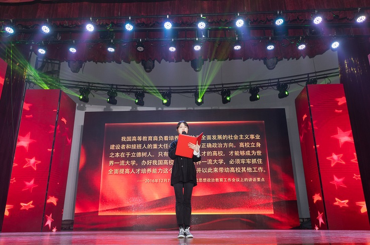 “今天,我们这样爱国!怀揣先辈的嘱托,时刻听候祖国的召唤”。临近尾声,主持俱乐部和朗诵俱乐部学生代表为我们带来了原创合诵。催人奋进的诗篇和雄壮激昂的歌声相互交织,抒发了建大学子的爱国情怀。