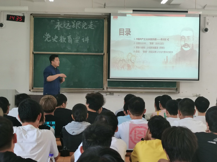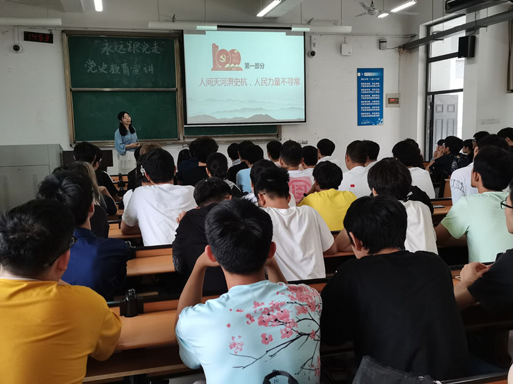 本网讯 为弘扬革命精神,传承红色基因,树立广大青年学党史、感党恩、听党话、跟党走的坚定信念,落实学校《关于组织开展2021年“永远跟党走”主题班会方案征集活动的通知》精神,6月4日,机电学院在逸夫楼5220举办“永远跟党走”党史教育宣讲暨辅导员主题班会观摩活动。机电学院辅导员杨慧老师和于曈老师担任本次观摩会主讲,全体辅导员和160名学生参加了此次活动。