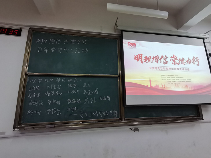本次党日活动主要分为三个环节,分别是党课学习、研讨交流、为党庆生。在第一个环节中,支部党员认真学习“明理增信,崇德力行”主题党课,一起回顾党的百年峥嵘历程。研讨交流环节,党员们积极参与、热情讨论。19级安全工程1班的陶然有感而发:“这次党课学习给我带来很大的震撼,我们如今安稳生活的背后是无数革命家的奋斗与鲜血,我们更应该好好珍惜当下的幸福生活。”18级安全工程专业的黄禧隆感慨说道:“如果我能够回到五四运动那一天,我想对青年领袖说一声:‘这盛世,如你所愿’。” 最后环节——为党庆生中,同学们积极参与,认真地留下了自己的签名,以此向党的百年华诞送上最真挚的祝福。