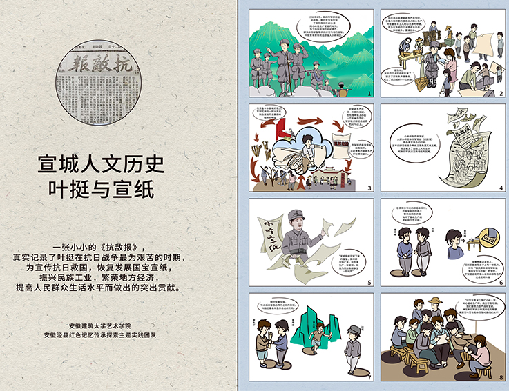 在“昔时铁军斗志强,今日青年多传唱”这一主题中,调研团走访了安徽泾县新四军军部旧址纪念馆、皖南事变烈士陵园等红色圣地,用心感悟传承铁军精神,创作了宣讲视频《昔时铁军斗志强,今日青年多传唱》和漫画《叶挺和宣纸》,多方位、多角度展现老一辈革命人的奋斗历程,鼓励年轻人重拾红色经典,重温红色路线,以革命记忆为当代青年的奋斗之路注入新的活力。