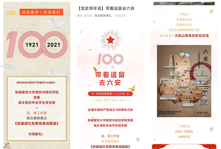 利用传统媒体、网络系列文章、短视频、H5动画、展板等多形式呈现《安徽省红色教育基地图鉴》,开展以“青春心向党 厚植爱国情”为主题的实践成果展,献礼建党百年华诞,激励当代大学生竖立坚定理想信念,从党史中汲取续写新辉煌的强大精神力量。