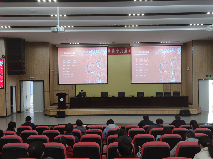 12月23日,纪委书记王玉兰在实验综合楼二楼报告厅为数理学院、材化学院全体党员师生解读十九届六中全会精神,报告会由学院党委书记主持。
