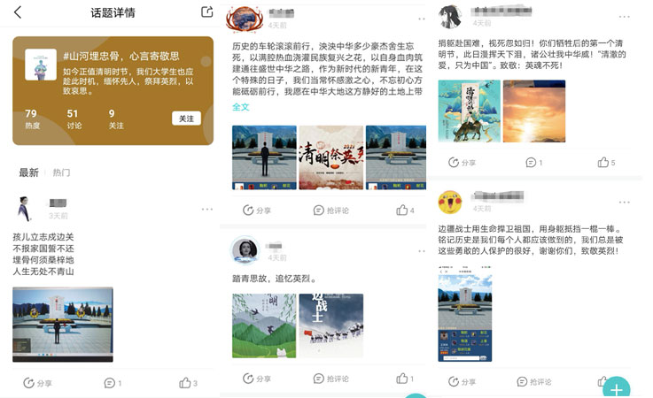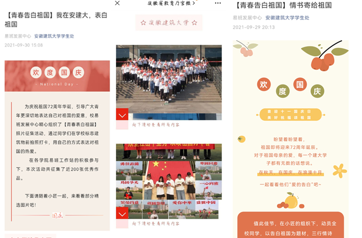 聚焦重要节点,提高党史学习教育的影响力。为强化党史学习教育效果,校易班发展中心结合清明节、新生入学、国庆、国家公祭日等重要时间节点,按照“线上话题引导先行,线下主题活动跟进”的原则,不断增强活动的影响力。如清明前夕,开展“学党史、祭英烈”主题活动,组织同学们线上祭扫和线下分享相结合,表达对革命先烈的缅怀之情;举办“铭记历史 珍爱和平”国家公祭日主题教育活动,组织观看有关南京大屠杀史实的教育影片,现场制作白色纸花祭英烈并默哀悼念,激励同学们不忘历史,珍惜当下;通过易班“优课”平台开展新生入学教育,将“永远跟党走”优秀辅导员主题班会融入入学教育课程,实现新生全覆盖,助力广大新生上好“开学第一课”;国庆期间,校易班中心组织开展“青春告白祖国”系列活动,征集向祖国表白的情书和照片150余件,推荐的优秀作品被安徽省教育厅和安徽省网络思政中心微信公众号转载宣传。丰富多彩的主题活动,不仅锻炼了广大学生的能力,更增强了同学们爱国情感,激励广大学生为实现中华民族伟大复兴贡献更多的青春力量。