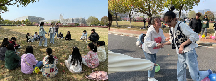 4月3日,学生会组织2021级学生与转专业学生一起在主教楼后的草坪上开展“集体中塑建自我,合作中拓展快乐”的户外活动。本次活动以小组为单位进行七龙枪珠、踩气球等团队小游戏。踩气球游戏,学生们以绳子连接,每人身上贴有气球,小组之间相互进行踩气球,大家你追我赶,欢乐不断。七龙枪珠,由参赛选手围成一个大圈,伴随着兔子舞音乐转圈舞动着,音乐停止,每组5号组员需快速争夺圈中乒乓球,同学们热情高涨,在博弈中不断碰撞出智慧的火花。大家在游戏中慢慢形成默契,相互信任,懂得在困难面前学会用沟通解决问题,形成了一个团结有爱的集体。