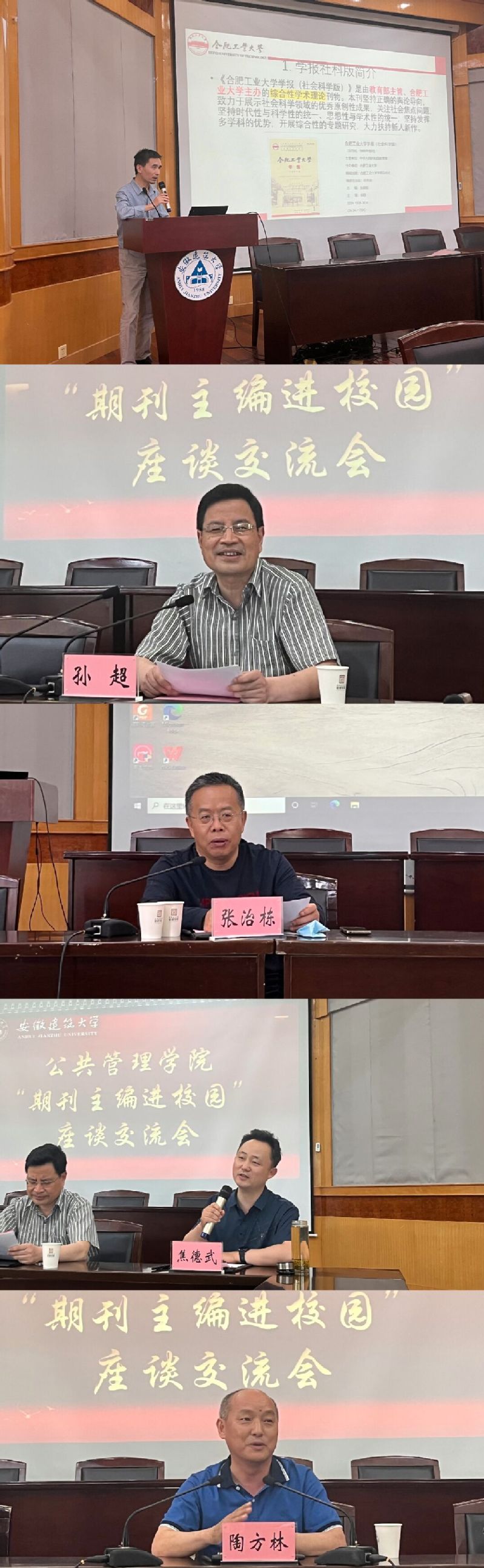 本网讯  为提升师生科研水平,拓展研究思路,激发科研动能,提高论文写作水平,5月25日下午,公共管理学院在北校区F楼三楼报告厅举办了“期刊主编进校园”座谈会(第一期)。此次活动邀请了《合肥工业大学学报(社会科学版)》主编李静教授、《安徽农业大学学报(社会科学版)》主编孙超教授、《安徽大学学报(哲学社会科学版)》主编张治栋教授、《华东经济管理》编辑部主任陶方林研究员和《江淮论坛》编辑室主任焦德武研究员。会议由学院副院长王秉义主持,学院班子成员、博士教师、2020和2021级公共管理研究生与会。
