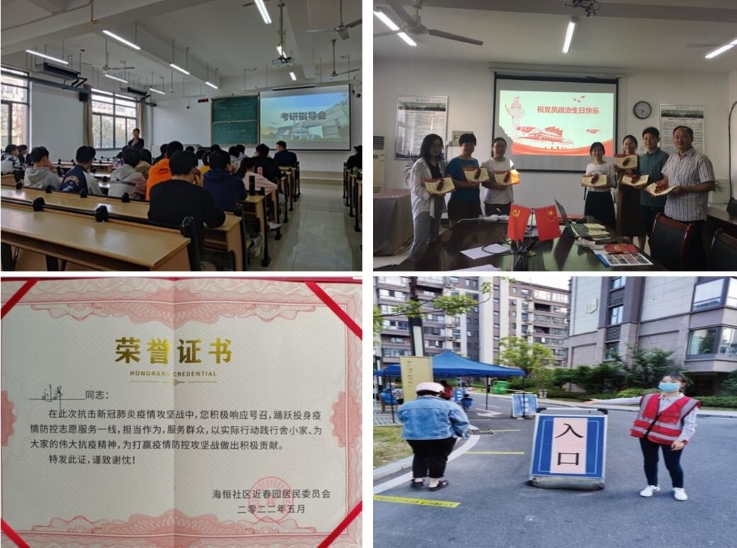 党支部认真组织开展主题党日活动,创新活动形式、丰富活动内容。召开“师生交流座谈会”,贴近学生,指导帮助学生成长进步;开展“我为师生办实事”活动,支部党员指导学生考研、就业,提升毕业生考研录取率和就业率;开展“课程思政研讨”活动,深入挖掘课程思政元素,在专业教学过程中加强大学生思想引导;开展“政治生日”活动,教育引导广大党员不忘初心,牢记教书育人职责使命;支部党员积极参与疫情防控等志愿服务活动,发挥党员先锋模范作用。支部党员施国栋获校优秀党员称号、刘洋获校优秀党务工作者称号。