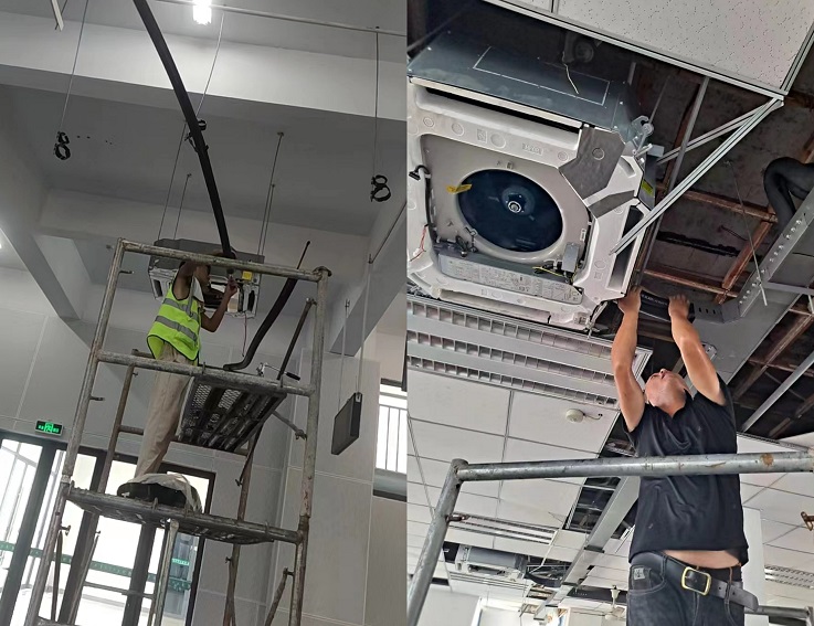 为有效改善师生的教学和学习环境,暑期南校区体育场馆及北校区图书馆自修室空调安装工程正式启动。南校区体育馆空调使用面积约5900㎡,覆盖兵乓球管、击剑馆、篮球馆、排球馆等场馆;北校区图书馆因年久老旧,缺乏空调安装条件,本次亦同步进行电源线路改造及空调安装,全面满足师生对空调使用的需求。同时对于各教室、食堂已有的空调,能源中心也进行了全面的维护清洗。高温酷暑下,空调安装工作人员无论在室内还是在室外,都是挥如雨,忘却炙烤与灼热,衣衫尽湿,流夹背,用辛劳换来我们的丝丝清凉。