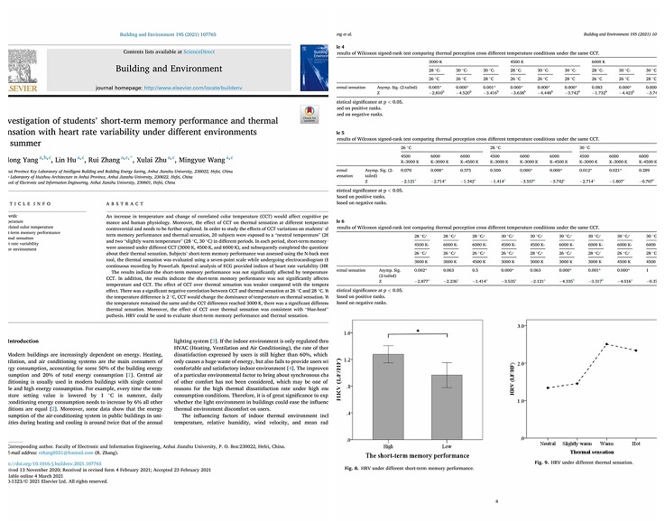 该论文通过研究在不同热环境条件下光环境中的色温对学习者的舒适度和学习性能的影响发现,在可接受的热环境条件下学习性能不受建筑室内温度和色温的影响;色温与热感觉之间的关系存在负相关,在热舒适范围内色温可以改变温度对热感觉的主导作用,且符合“色相”假说;心率变异性(HRV)可以作为潜在的生理因素反映人们对环境的感知。(文:张睿 ;审稿:陈杰)
