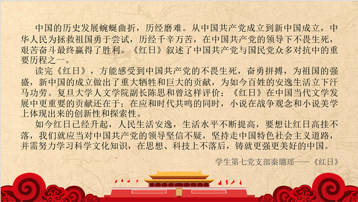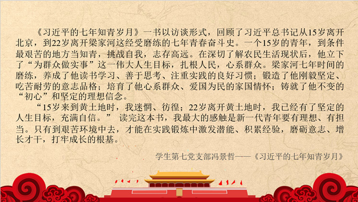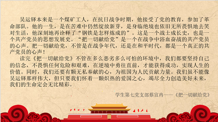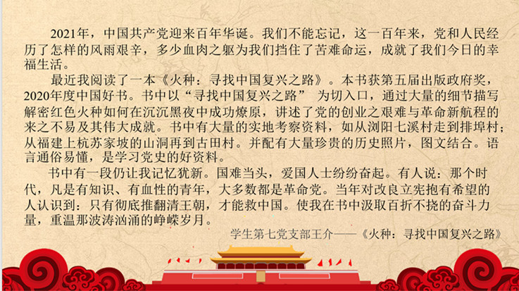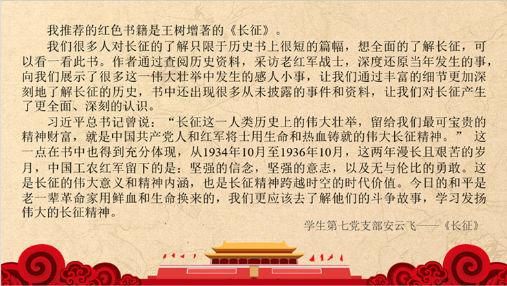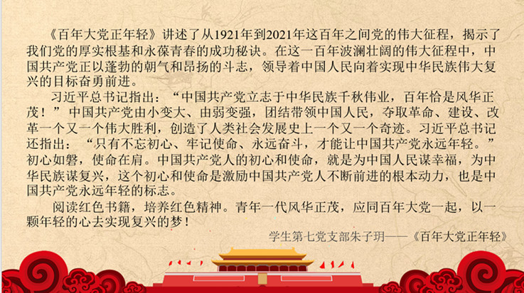 本次活动采用线上分享形式,受到同学们的积极响应。分享的每一本书,每一段话都表达着对中国共产党、对国家、对革命先驱的热爱与敬佩。