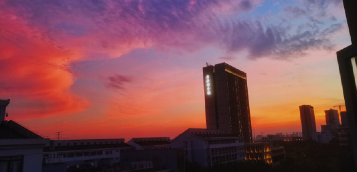 “夕阳斜照,高楼屹立,风卷火云,美不胜收。”