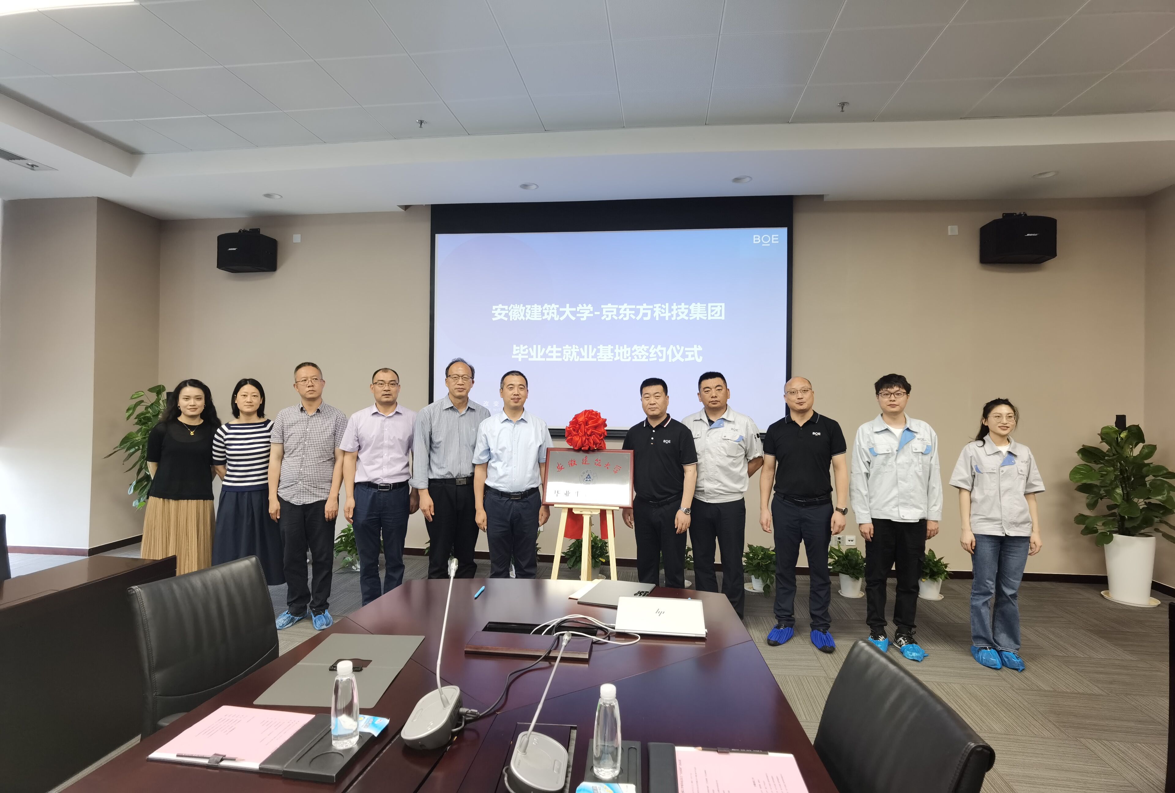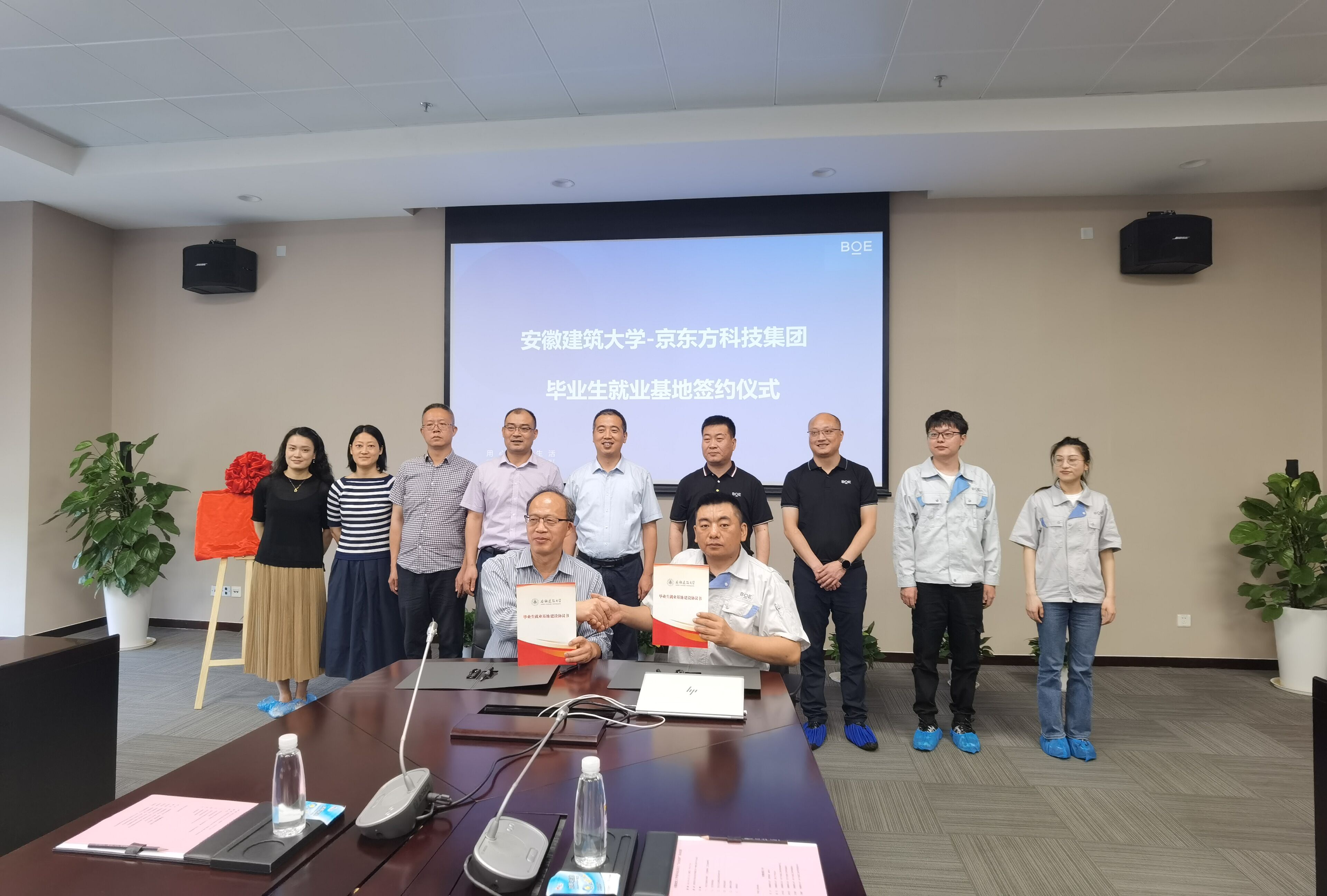 校就业工作处处长魏东和京东方科技集团合肥区域办党委书记、总经理李宾代表校企双方,签订了毕业生就业基地建设协议书,闵杰与李宾共同为毕业生就业基地揭牌。(文/图:丁媛媛 杨玲 ;审稿:孙长城)