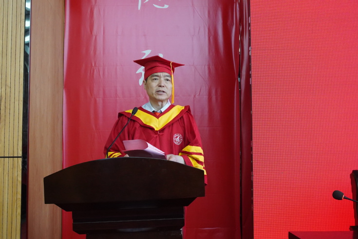 最后,校党委副书记、校长黄显怀教授发表校长致辞。他代表学校向全体毕业生圆满完成学业,即将开始新的人生航程表示热烈祝贺。他表示,为大家今天的成长和成熟感到欣慰,对大家的美好未来充满期待;对大家即将离别满怀不舍和留恋,为大家即将踏上新的漫漫长路充满牵挂。作为临行前最后的嘱托,他对毕业生们提出了三点期望:一是保持勤学善思的状态,树立追梦圆梦的志向;二是保持向上生长的姿态,坚定笃行不怠的脚步;三是保持乐观积极的心态,成就自信自强的人生。