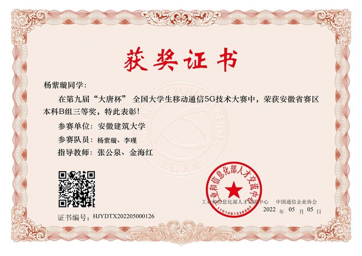 本网讯  近日,第九届“大唐杯”全国大学生新一代信息通信技术大赛全国总决赛圆满结束。我校电子与信息工程学院组织参赛的2支队伍全部获奖,分别荣获安徽赛区一等奖1项,三等奖1项,并晋级全国总决赛,荣获全国赛区三等奖1项。