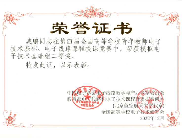 本网讯  20221217日至18日,第四届全国高等学校青年教师电子技术基础、电子线路课程授课竞赛全国总决赛在北京航空航天大学举办。经过激烈角逐,我校电子与信息工程学院教师戚鹏荣获全国赛区二等奖。