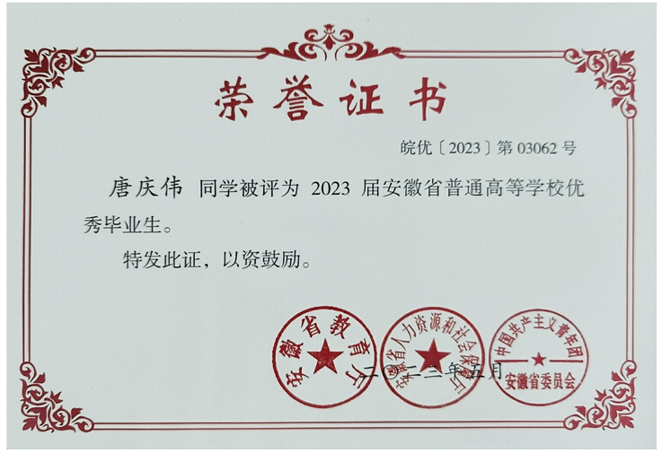 功夫不负有心人,唐庆伟的表现和成绩赢得了众多的荣誉,先后获得了安徽省优秀毕业生、安徽省优秀硕士论文、三好研究生等荣誉称号,并在毕业时以优异的成绩被合肥工业大学录取为2023级博士研究生, 未来还会在学术的道路上继续探索。