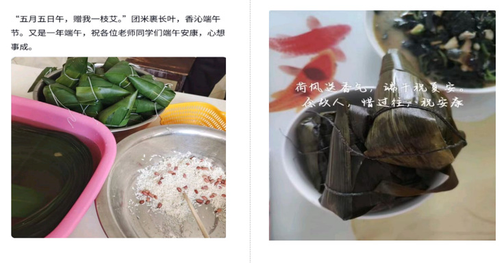 本次活动将端午佳节的传统文化习俗与中华传统诗词相结合,通过组织同学们分享各自家乡的节日习俗和文化内涵,加以“诗词颂端午,妙语赞端午”的形式开展活动。活动当天,同学们热情高涨,纷纷“晒”出自己在端午佳节所享用的美味粽子。青绿的粽叶包裹着亮白的糯米,配上各类各样的辅料组成了香甜软糯的粽子。小小的粽子里,囊括了节日的喜悦,囊括了家的味道,囊括了青色的古意;古老的诗词里,传递出安康的祈愿,传递出团圆的欢欣,传递出传统文化的赓续。