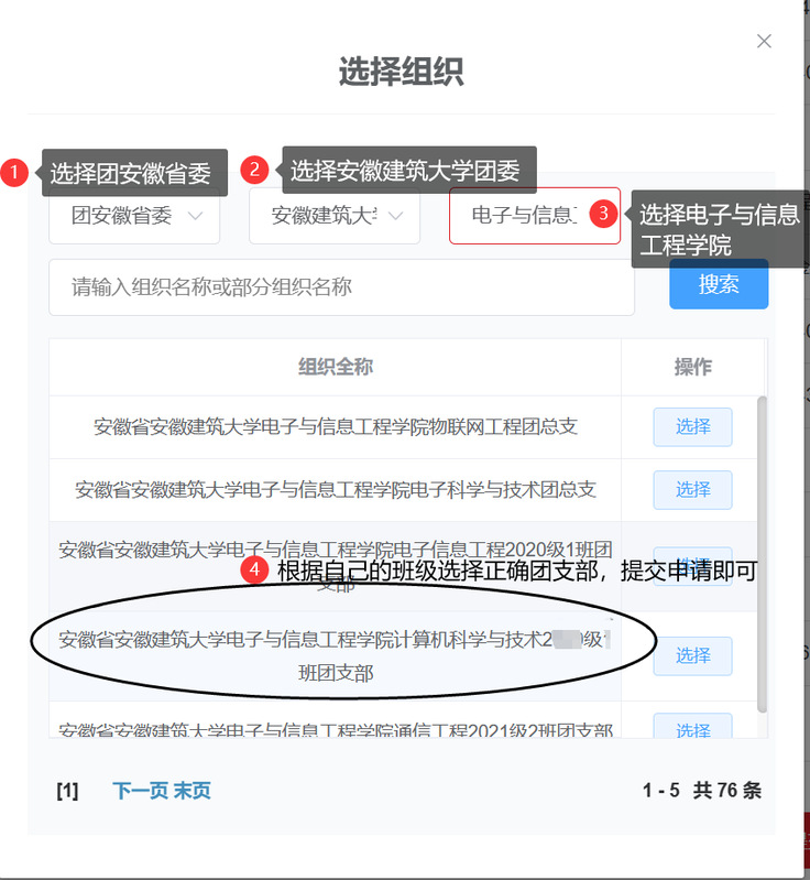 注:1.已经发起转接并且转接成功,但不在对应团支部的同学需重新发起转接,转入对应所在班级团支部,操作流程如上。