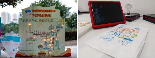 活动当同学们热情高涨,积极踊跃地去寻找徽弘门易海亭、实验综合楼、图书馆等学校标志性景点进行印章和合影打卡在志愿者的引导下在活动现场与学院虚拟形象“电小信”合照祖国母亲74岁生日快乐。