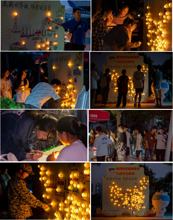 天色渐晚,华灯初上,点灯活动签到处排起了长龙,现场气氛热烈,同学们耐心引导排队签到,领取星星灯,亲手点亮在描绘着伟大祖国大好河山的彩绘展板上,寄托对祖国的美好祝愿也蕴含着青年当有志,立志在四方祖国需要处,皆是我故乡美好寓意