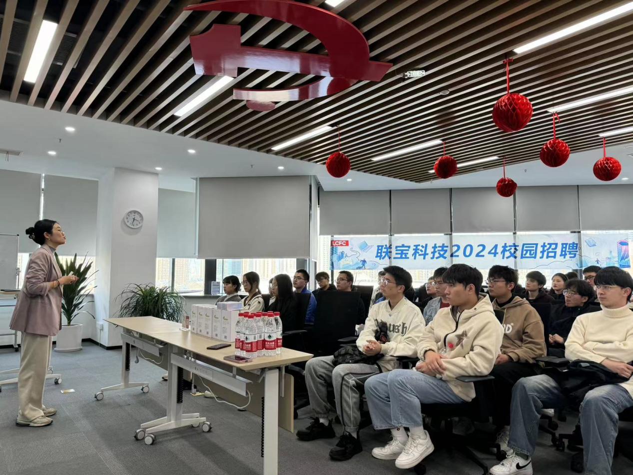 在调研洽谈开始前,电信学院40余名毕业班学生乘坐大巴来到联宝科技研发中心进行实地走访参观,在工作人员的介绍下初步了解公司研发情况,切身感受工作环境。随后,在联宝科技会议室开展2024春招专场宣讲会。