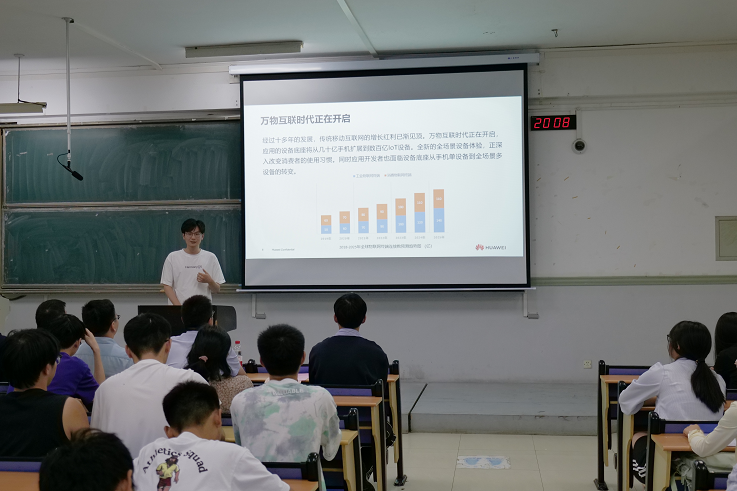 华为鸿蒙开发认证工程师李晟老师向大家介绍了“华为鸿蒙创新班”的学习内容。他以形象生动的话语向大家展示了万物互联的时代背景和新场景下出现的问题,并向大家详细讲解了鸿蒙系统的定义、发展历史、应用场景和自研工具等。